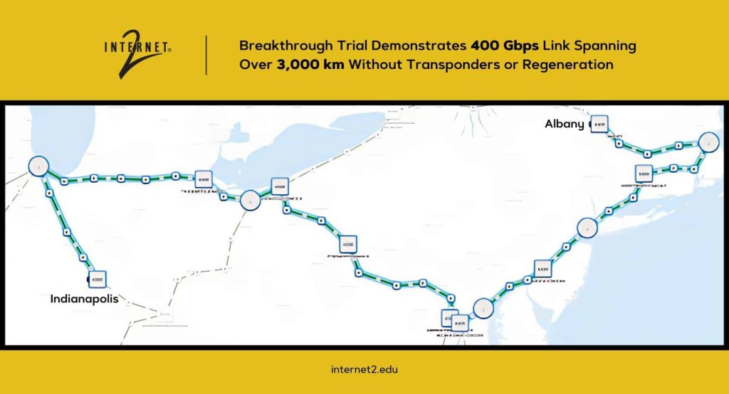 Map of the over 3,000 km 400 Gbps link on the Internet2 network between Albany and Indianapolis with no transponders or regeneration.