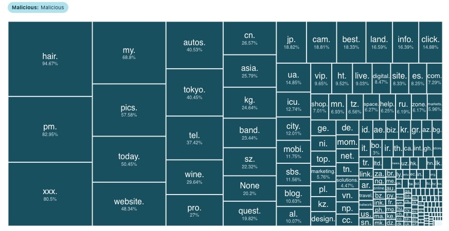 Entre estos, el dominio .hair es el que registra el mayor porcentaje de correos maliciosos (95%), lo que sugiere que es utilizado casi exclusivamente para actividades fraudulentas.