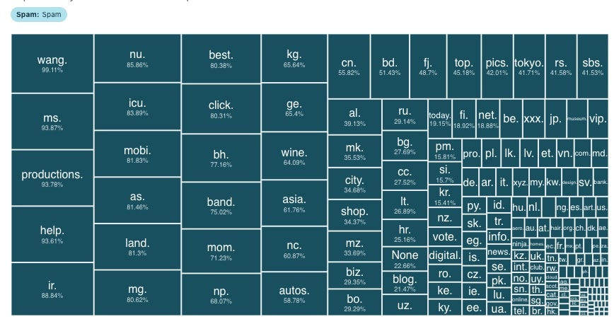 El dominio .wang destaca con un 99,1% de correos de spam, lo que lo convierte en una opción preferida para el envío de publicidad masiva no solicitada.